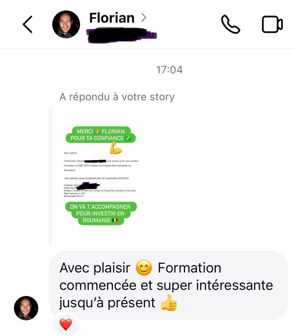 "Merci beaucoup à Laurent pour tous ses supers conseils. Son instagram est une pépite. J'ai acheté sa formation CIE 2025 et je vais pouvoir acheter bientôt un appartement pour investir en Roumanie."